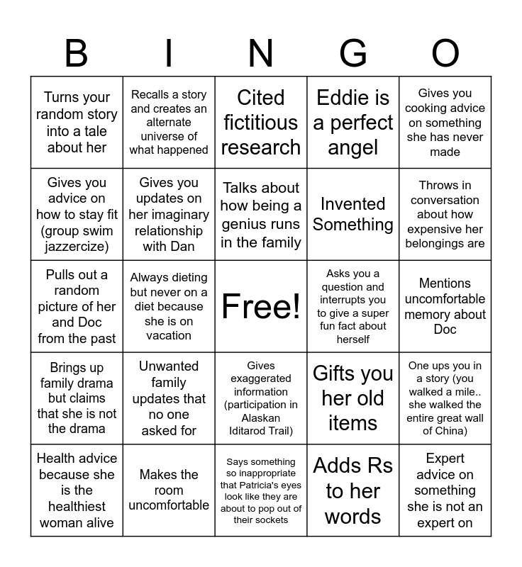 This bingo card has a free space and 24 words: Unwanted family updates that no one asked for, Makes the room uncomfortable, Talks about how being a genius runs in the family, Health advice because she is the healthiest woman alive, Gives you cooking advice on something she has never made, Turns your random story into a tale about her, Gives you advice on how to stay fit (group swim jazzercize), Recalls a story and creates an alternate universe of what happened, Asks you a question and interrupts you to give a super fun fact about herself, Gives exaggerated information (participation in Alaskan Iditarod Trail), Invented Something, Pulls out a random picture of her and Doc from the past, Gifts you her old items, One ups you in a story (you walked a mile.. she walked the entire great wall of China), Gives you updates on her imaginary relationship with Dan, Adds Rs to her words, Mentions uncomfortable memory about Doc, Cited fictitious research, Throws in conversation about how expensive her belongings are, Always dieting but never on a diet because she is on vacation, Expert advice on something she is not an expert on, Brings up family drama but claims that she is not the drama, Eddie is a perfect angel and Says something so inappropriate that Patricia's eyes look like they are about to pop out of their sockets.
