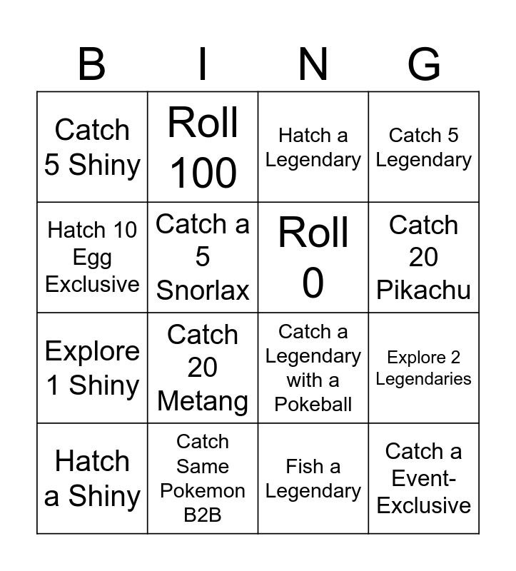 This bingo card has 16 words: Catch Same Pokemon B2B, Explore 2 Legendaries, Hatch a Legendary, Catch 5 Shiny, Explore 1 Shiny, Roll 100, Catch a Legendary with a Pokeball, Fish a Legendary, Hatch 10 Egg Exclusive, Catch a 5 Snorlax, Hatch a Shiny, Catch 5 Legendary, Catch 20 Metang, Catch 20 Pikachu, Roll 0 and Catch a Event-Exclusive.