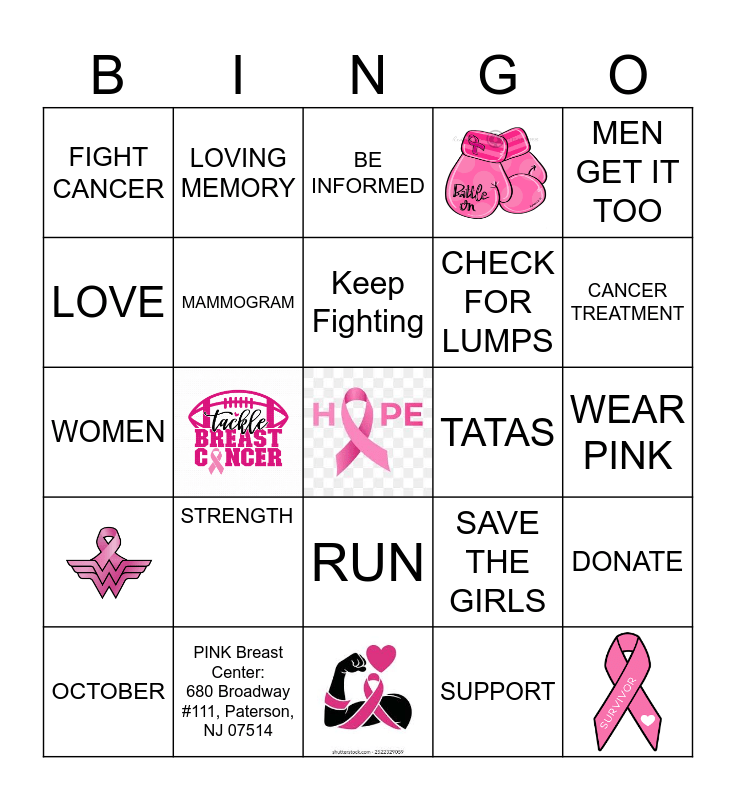 This bingo card has 5 images, a free space and 19 words: STRENGTH, PINK Breast Center: 680 Broadway #111, Paterson, NJ 07514, Keep Fighting, OCTOBER, MEN GET IT TOO, FIGHT CANCER, LOVE, LOVING MEMORY, TATAS, RUN, CHECK FOR LUMPS, WOMEN, SAVE THE GIRLS, DONATE, MAMMOGRAM, SUPPORT, WEAR PINK, BE INFORMED and CANCER TREATMENT.