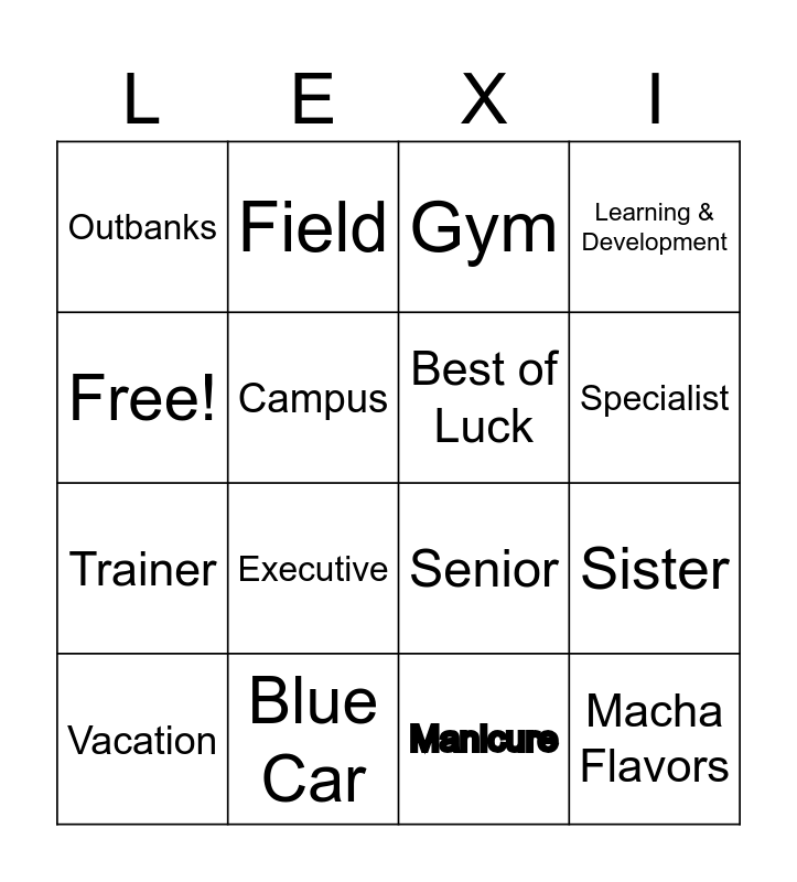 This bingo card has 16 words: Blue Car, Sister, Gym, Outbanks, Trainer, Field, Senior, Manicure, Free!, Campus, Vacation, Learning & Development, Executive, Specialist, Best of Luck and Macha Flavors.