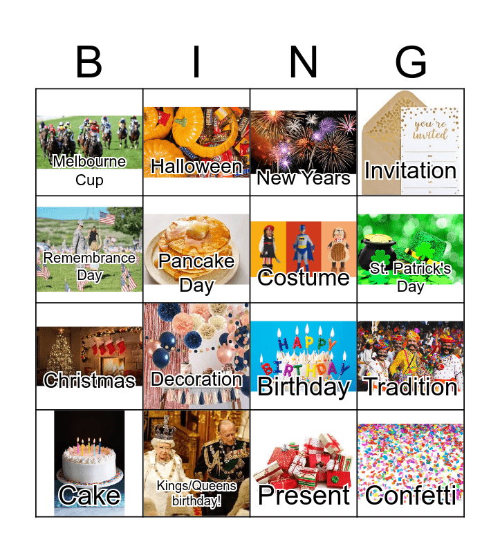 This bingo card has 25 images and 25 words: New Years, Valentine's Day, St. Patrick's Day, Easter, Remembrance Day, Melbourne Cup, Pancake Day, Halloween, Kings/Queens birthday!, Thanksgiving, Christmas, Birthday, Parade, Celebration, Costume, Feast, Present, New Years, Decoration, Tradition, Cake, Balloons, Confetti, Invitation and Party.