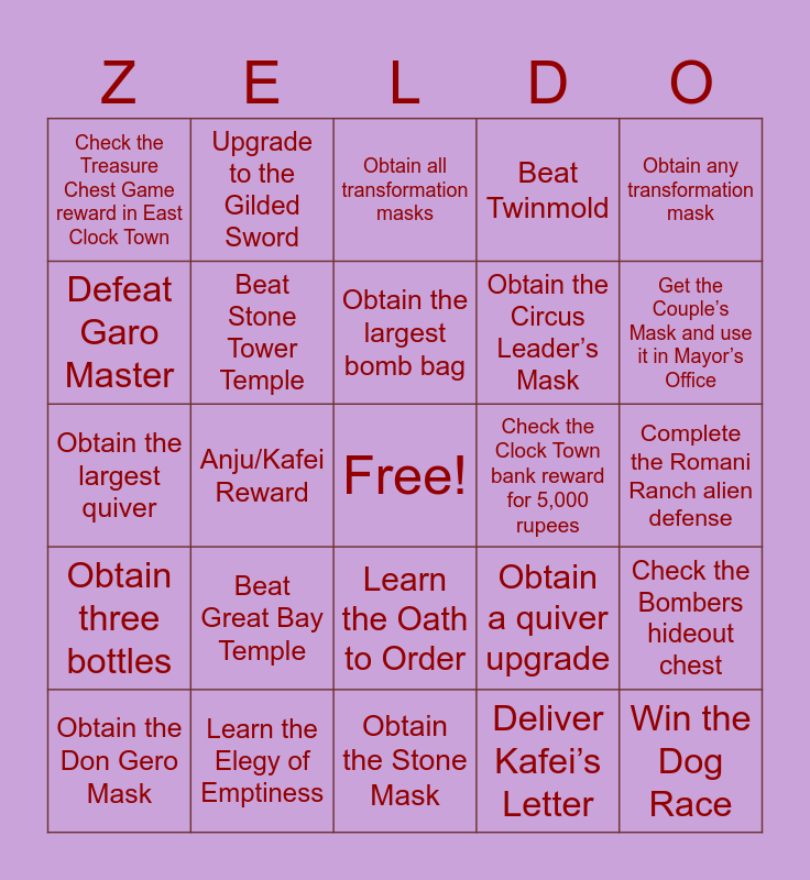 This bingo card has a free space and 93 words: Obtain the Bunny Hood, Obtain the Blast Mask, Obtain the Stone Mask, Obtain the Mask of Truth, Obtain the Garo’s Mask, Obtain the Captain’s Hat, Obtain the Gibdo Mask, Obtain the Don Gero Mask, Obtain the Romani Mask, Obtain the Kafei Mask, Obtain the Couple’s Mask, Obtain the Kamaro Mask, Obtain the Postman’s Hat, Obtain the Circus Leader’s Mask, Obtain the All-Night Mask, Obtain any transformation mask, Obtain all transformation masks, Restore the Great Fairy in Clock Town, Restore the Great Fairy in Woodfall, Restore the Great Fairy in Snowhead, Restore the Great Fairy in Great Bay, Restore the Great Fairy in Ikana, Beat Woodfall Temple, Beat Snowhead Temple, Beat Great Bay Temple, Beat Stone Tower Temple, Collect all stray fairies in any temple, Learn the Sonata of Awakening, Learn the Goron Lullaby, Learn the New Wave Bossa Nova, Learn the Elegy of Emptiness, Learn the Oath to Order, Unlock all owl statues, Upgrade your sword to Razor Sword, Upgrade to the Gilded Sword, Obtain a wallet upgrade, Obtain the largest wallet, Obtain a bomb bag upgrade, Obtain the largest bomb bag, Obtain a quiver upgrade, Obtain the largest quiver, Obtain three bottles, Complete the Romani Ranch alien defense, Complete Cremia’s wagon escort, Win the Dog Race, Win the Deku Playground once, Win the Deku Playground all three days, Win the Town Shooting Gallery, Win the Swamp Shooting Gallery, Win the Goron Races, Win the Beaver Race, Deliver Kafei’s Letter, Retrieve the Sun’s Mask, Complete the Anju and Kafei sidequest, Help the Postman find freedom, Return the stolen item to the Curiosity Shop, Collect the Romani Mask from Cremia, Obtain the Couple’s Mask from Anju and Kafei, Deliver milk from the Ranch to Clock Town, Get the Chateau Romani bottle, Anju/Kafei Reward, Light all torches in Goron Shrine, Complete the Ikana Graveyard captain event, Defeat Captain Keeta, Defeat Igos du Ikana, Defeat the Gekko mini-boss in Woodfall, Defeat Wizrobe, Defeat Wart, Defeat Garo Master, Defeat Gomess, Beat Gyorg, Beat Odolwa, Beat Goht, Beat Twinmold, Collect two Great Fairy rewards, Defeat Twinmold without Giant’s Mask, Get the Couple’s Mask and use it in Mayor’s Office, Check the Bombers hideout chest, Check the Observatory telescope reward, Check the Stock Pot Inn key chest, Check the Clock Town bank reward for 200 rupees, Check the Clock Town bank reward for 1,000 rupees, Check the Clock Town bank reward for 5,000 rupees, Check the Treasure Chest Game reward in East Clock Town, Check the Deku Playground reward on Day 1, Check the Deku Playground reward on Day 2, Check the Deku Playground reward on Day 3, Check the Swamp Tourist Center photo reward, Check the Woods of Mystery witch reward, Check the Koume boat cruise reward, Check the Ikana Canyon secret grotto chest, Check the Beneath the Well chest behind Gibdos and Check the Mountain Village smithy reward.