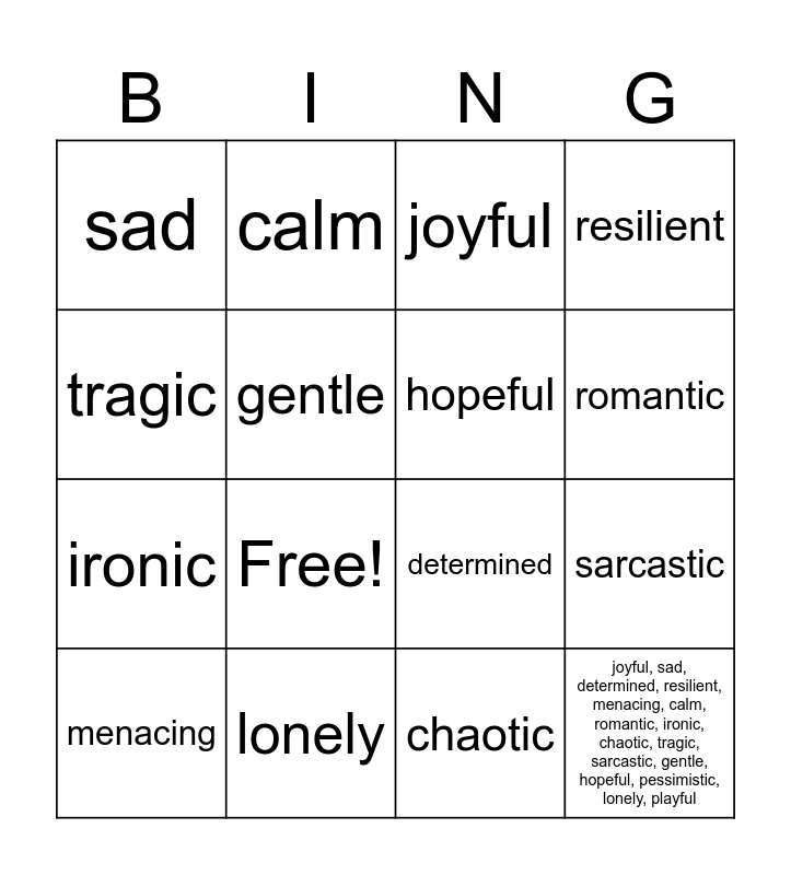 This bingo card has 18 words: Free!, joyful, sad, determined, resilient, menacing, calm, romantic, ironic, chaotic, tragic, sarcastic, gentle, hopeful, pessimistic, lonely, playful, joyful, sad, determined, resilient, menacing, calm, romantic, ironic, chaotic, tragic, sarcastic, gentle, hopeful, pessimistic, lonely and playful.