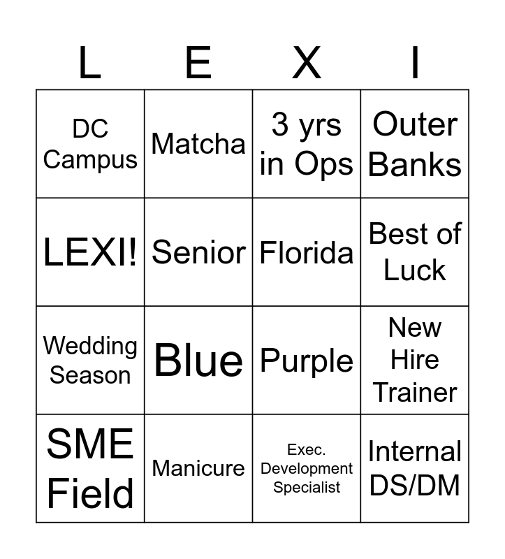 This bingo card has 16 words: Manicure, New Hire Trainer, 3 yrs in Ops, DC Campus, Wedding Season, Matcha, Purple, Exec. Development Specialist, LEXI!, Senior, SME Field, Outer Banks, Blue, Best of Luck, Florida and Internal DS/DM.