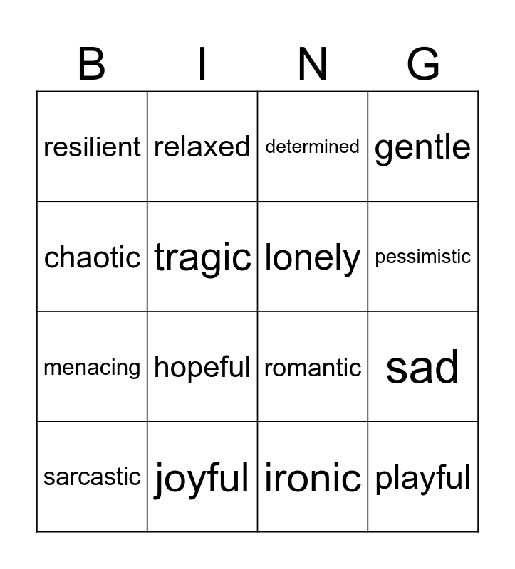 This bingo card has 16 words: joyful, sad, determined, resilient, menacing, relaxed, romantic, ironic, chaotic, tragic, sarcastic, gentle, hopeful, pessimistic, lonely and playful.