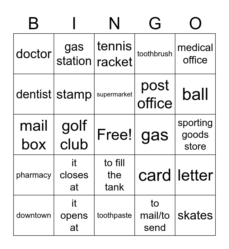 This bingo card has a free space and 24 words: it closes at, it opens at, supermarket, downtown, medical office, doctor, dentist, gas station, gas, to fill the tank, post office, mail box, card, letter, stamp, to mail/to send, sporting goods store, tennis racket, ball, golf club, skates, pharmacy, toothbrush and toothpaste.