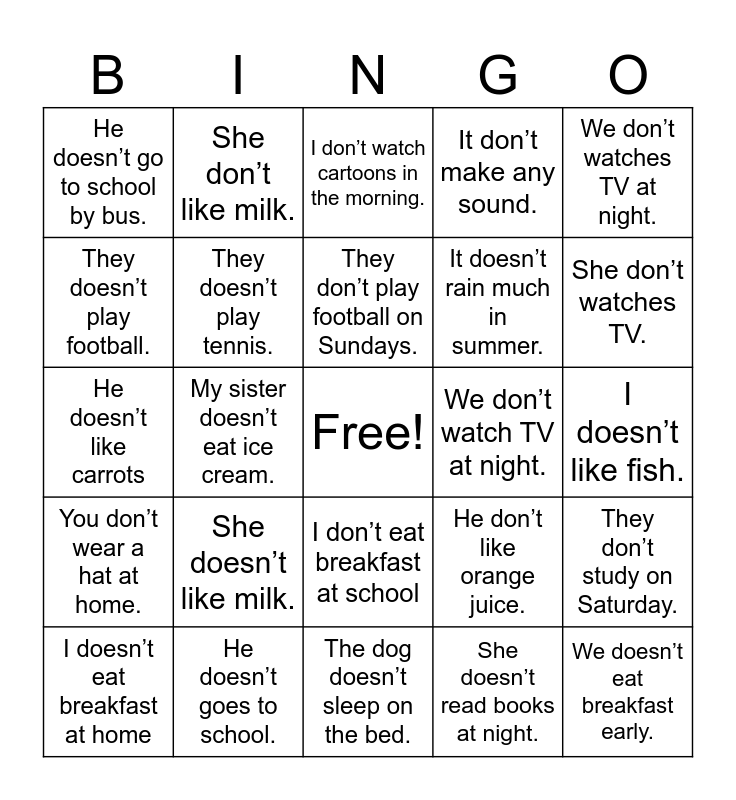 This bingo card has a free space and 24 words: She doesn’t like milk., He doesn’t goes to school., They don’t play football on Sundays., I doesn’t eat breakfast at home, We don’t watches TV at night., He doesn’t go to school by bus., They doesn’t play football., She don’t like milk., We don’t watch TV at night., I don’t eat breakfast at school, It doesn’t rain much in summer., He doesn’t like carrots, He don’t like orange juice., They don’t study on Saturday., They doesn’t play tennis., She doesn’t read books at night., I doesn’t like fish., I don’t watch cartoons in the morning., She don’t watches TV., My sister doesn’t eat ice cream., We doesn’t eat breakfast early., You don’t wear a hat at home., It don’t make any sound. and The dog doesn’t sleep on the bed..