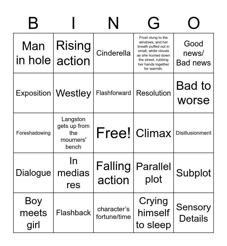This bingo card has a free space and 24 words: In medias res, Flashback, Flashforward, Boy meets girl, Good news/ Bad news, Man in hole, Exposition, Rising action, Climax, Falling action, Resolution, Foreshadowing, Parallel plot, Subplot, Westley, Crying himself to sleep, Disillusionment, Cinderella, Bad to worse, Langston gets up from the mourners' bench, Sensory Details, Dialogue, Frost clung to the windows, and her breath puffed out in small, white clouds as she hurried down the street, rubbing her hands together for warmth. and character’s fortune/time.