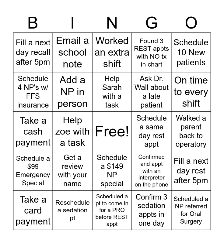 This bingo card has a free space and 24 words: Get a review with your name, Reschedule a sedation pt, Help Sarah with a task, Take a card payment, Schedule 10 New patients, Fill a next day recall after 5pm, Schedule 4 NP's w/ FFS insurance, Email a school note, Schedule a same day rest appt, Schedule a $149 NP special, Ask Dr. Wall about a late patient, Take a cash payment, Confirmed and appt with an interpreter on the phone, Fill a next day rest after 5pm, Add a NP in person, Confirm 3 sedation appts in one day, Walked a parent back to operatory, Worked an extra shift, On time to every shift, Help zoe with a task, Scheduled a NP referred for Oral Surgery, Schedule a $99 Emergency Special, Found 3 REST appts with NO tx in chart and Scheduled a pt to come in for a PRO before REST appt.
