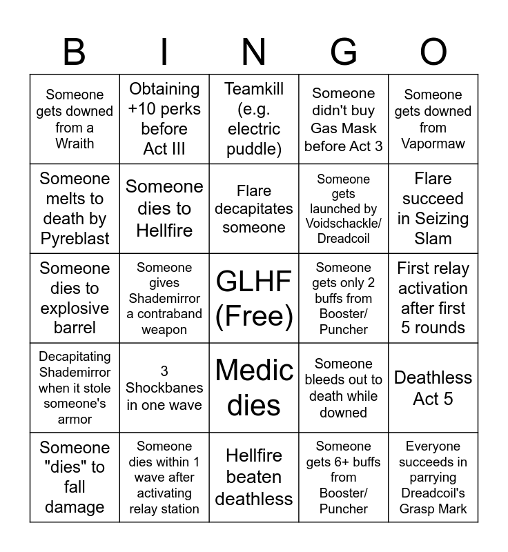 This bingo card has a free space and 24 words: 3 Shockbanes in one wave, Someone dies within 1 wave after activating relay station, Flare decapitates someone, Someone "dies" to fall damage, Someone gets downed from Vapormaw, Someone gets downed from a Wraith, Someone melts to death by Pyreblast, Obtaining +10 perks before Act III, Someone gets only 2 buffs from Booster/ Puncher, Medic dies, Someone gets launched by Voidschackle/ Dreadcoil, Someone dies to explosive barrel, Someone bleeds out to death while downed, Deathless Act 5, Someone dies to Hellfire, Someone gets 6+ buffs from Booster/ Puncher, First relay activation after first 5 rounds, Teamkill (e.g. electric puddle), Flare succeed in Seizing Slam, Someone gives Shademirror a contraband weapon, Everyone succeeds in parrying Dreadcoil's Grasp Mark, Decapitating Shademirror when it stole someone's armor, Someone didn't buy Gas Mask before Act 3 and Hellfire beaten deathless.
