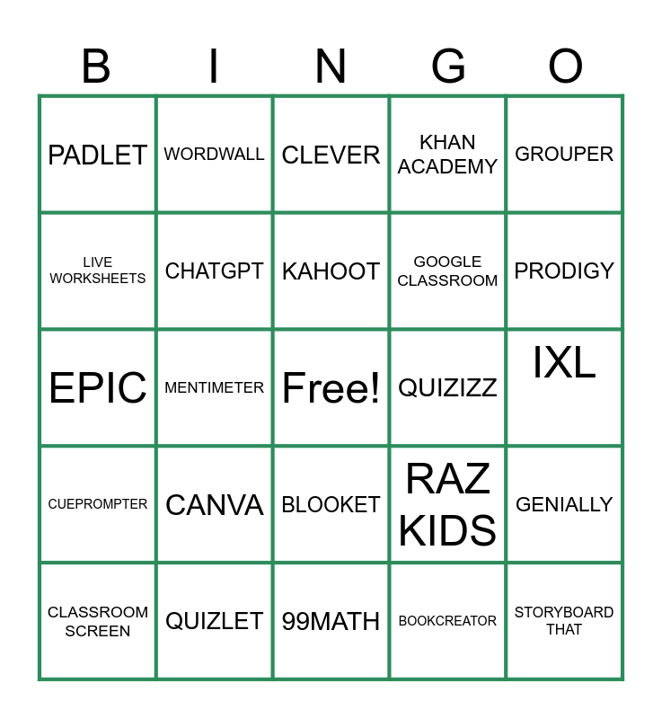 This bingo card has a free space and 24 words: CANVA, QUIZLET, KAHOOT, CLASSROOM SCREEN, GROUPER, PADLET, LIVE WORKSHEETS, WORDWALL, QUIZIZZ, BLOOKET, GOOGLE CLASSROOM, EPIC, RAZ KIDS, GENIALLY, CHATGPT, BOOKCREATOR, IXL, CLEVER, PRODIGY, MENTIMETER, STORYBOARD THAT, CUEPROMPTER, KHAN ACADEMY and 99MATH.