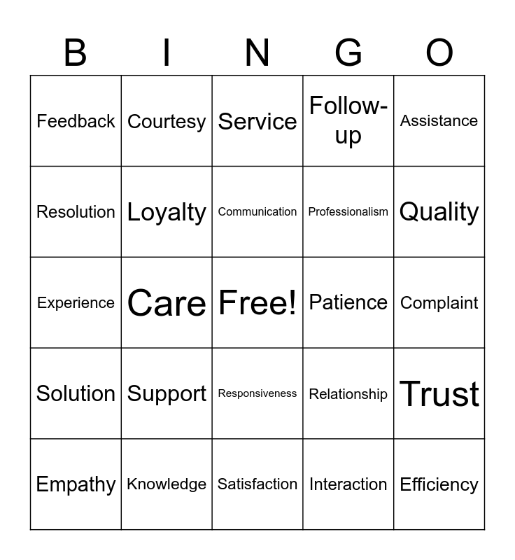 This bingo card has a free space and 25 words: Support, Satisfaction, Communication, Empathy, Assistance, Feedback, Resolution, Courtesy, Patience, Responsiveness, Professionalism, Experience, Relationship, Trust, Loyalty, Helpdesk, Complaint, Service, Quality, Care, Efficiency, Knowledge, Solution, Follow-up and Interaction.