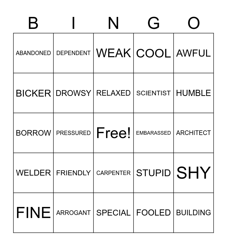 This bingo card has a free space and 175 words: #JOB, ACCOUNTANT, ACTOR, AIRFORCE, ARCHITECT, ARMY/MILITARY, ARTIST, ASSISTANT, AUTHOR, BASEBALL PLAYER, BECOME, BLOG, BORROW, BOSS, BUILDING, BUSINESS, CARPENTER, COMMUTE, COMPANY, COMPUTER, CONSTRUCTION WORKER, DENTIST, DOCTOR, ELECTRICIAN, EMERGENCY, EMPLOYEE, FARM, FIREMAN, GOVERNMENT, HOSPITAL, INFANTRY, JAIL/PRISON, JANITOR, JOB, LAWYER, LIBRARIAN, MAILMAN, MANAGER, MANUFACTURER, MECHANIC/PLUMBER, MOVE, MOVE-out, MOVIE, NAVY, NURSE, OFFICE, ONLINE SHOPPING, PHOTOGRAPHER, PILOT, POLICEMAN, PRESIDENT, PROFESSOR/TEACHER, SCIENTIST, SECRETARY, SERVICE, SHOPPING, SUPPORT, SURGEON, VLOG, WAITER/WAITRESS, WELDER, ABANDONED, AFFAIR, AGGRESSIVE, AGONY/GRIEF, AGREE, ANNOYING, ANXIOUS, ARGUE, ARROGANT, AWESOME, AMAZING, AWFUL, BAD, BEAUTIFUL, BEHAVIOR, BICKER, BORED, BRAVE, BURDENED, CAREFUL, CHEAT, COLD, COMPLAIN, COMPLICATED/COMPLEX, CONFIDENT, CONFUSED, COOL, CREATIVE, CUTE, DEFEATED, DEPENDENT, DEPRESSED, DETERMINED, DISAGREE, DROWSY, EMBARASSED, EXCITED, FAMOUS, FEELINGS, FIGHT, FINE, FOOLED, FRIENDLY, FRUSTRATED, FUNNY, GET-ALONG, GOSSIP, GREEDY, GROUCHY, GUILTY, HANDSOME, HAPPY, HATE, HOT, HUMBLE, INNOCENT, INSULT, JEALOUS/ENVIOUS, LAZY, LIE, LONELY, LOUSY, LUCKY, MAD/ANGRY, MEAN, NERVOUS, NIT-WIT, NOSY, not-FINE, OBSESSED, OK, OLD, PATIENT, PITY, POOR, POPULAR, PRESSURED, PROUD, QUIET, RAGE, REJECTED, RELAXED, RELIEVED, RICH/WEALTHY, RUDE, SAD, SAFE, SCARED, SHY, SILLY/FOOLISH, SLOW, SMART, SNEAKY, SOFT-HEARTED, SO-SO, SPECIAL, STRANGE, STRICT, STRONG, STUBBORN, STUPID, SUFFER, TAKE-ADVANTAGE, TEMPTED, TROUBLE, TRUST, UGLY, UPSET, WEAK, WONDERFUL, WORRY, WOW, YELL and YOUNG.