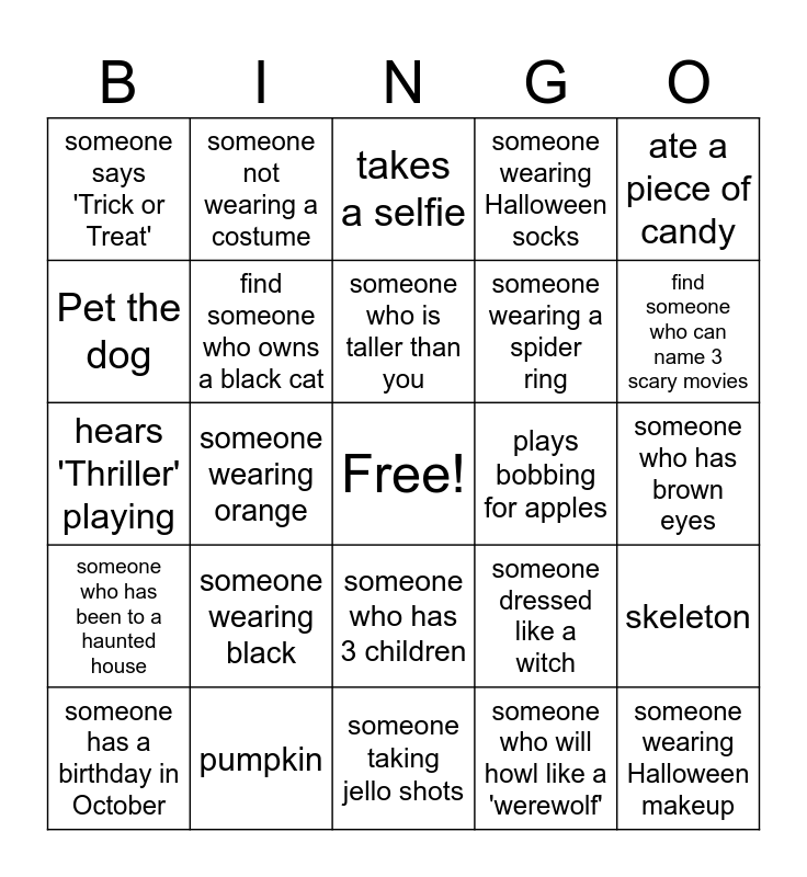 This bingo card has a free space and 24 words: someone wearing black, pumpkin, someone who is taller than you, someone has a birthday in October, ate a piece of candy, someone says 'Trick or Treat', Pet the dog, someone not wearing a costume, plays bobbing for apples, someone who has 3 children, someone wearing a spider ring, hears 'Thriller' playing, someone dressed like a witch, skeleton, find someone who owns a black cat, someone who will howl like a 'werewolf', someone who has brown eyes, takes a selfie, find someone who can name 3 scary movies, someone wearing orange, someone wearing Halloween makeup, someone who has been to a haunted house, someone wearing Halloween socks and someone taking jello shots.