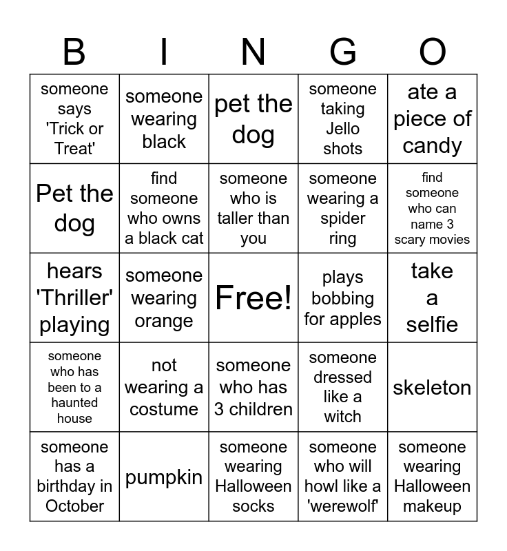 This bingo card has a free space and 24 words: not wearing a costume, pumpkin, someone who is taller than you, someone has a birthday in October, ate a piece of candy, someone says 'Trick or Treat', Pet the dog, someone wearing black, plays bobbing for apples, someone who has 3 children, someone wearing a spider ring, hears 'Thriller' playing, someone dressed like a witch, skeleton, find someone who owns a black cat, someone who will howl like a 'werewolf', take a selfie, pet the dog, find someone who can name 3 scary movies, someone wearing orange, someone wearing Halloween makeup, someone who has been to a haunted house, someone taking Jello shots and someone wearing Halloween socks.