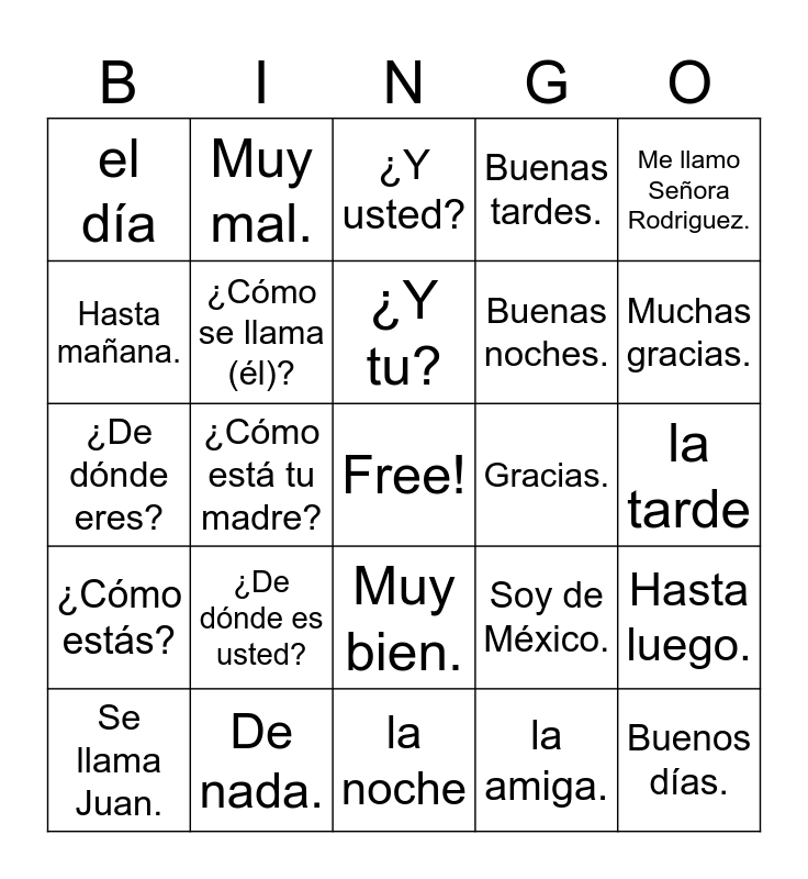 This bingo card has a free space and 33 words: ¿Qué tal?, ¿Cómo está usted?, ¿Cómo está tu madre?, ¿Cómo te llamas?, ¿Cómo estás?, ¿Cómo se llama (él)?, Me llamo Señora Rodriguez., Se llama Juan., Muy mal., Así, así., ¿Y tu?, ¿Y usted?, Mucho gusto., Por favor., Gracias., Muchas gracias., De nada., ¿De dónde eres?, ¿De dónde es usted?, Soy de México., Muy bien., Hola., el día, la tarde, la noche, Buenos días., Buenas tardes., Buenas noches., Hasta mañana., Hasta luego., el amigo, la amiga. and Adiós..
