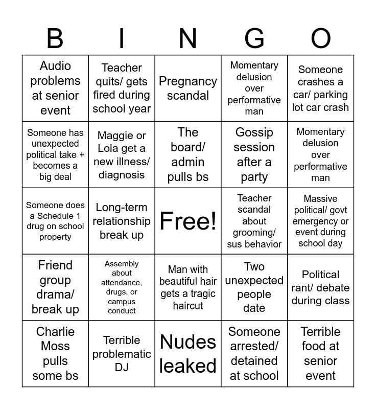 This bingo card has a free space and 29 words: Charlie Moss pulls some bs, Performative man ends up being racist, Long-term relationship break up, Groupchat/ discord screenshots, Audio problems at senior event, Pregnancy scandal, Maggie or Lola get a new illness/ diagnosis, Assembly about attendance, drugs, or campus conduct, Teacher scandal about grooming/ sus behavior, Terrible problematic DJ, Massive political/ govt emergency or event during school day, Terrible food at senior event, Nudes leaked, Someone arrested/ detained at school, Momentary delusion over performative man, Kid gets cancelled for slurs, Man with beautiful hair gets a tragic haircut, Friend group drama/ break up, Someone crashes a car/ parking lot car crash, Someone does a Schedule 1 drug on school property, Two unexpected people date, Nice guy/ stalker situation, Gossip session after a party, Someone has unexpected political take + becomes a big deal, Momentary delusion over performative man, Teacher quits/ gets fired during school year, Political rant/ debate during class, The board/ admin pulls bs and Jayden gets exposed for some bs.