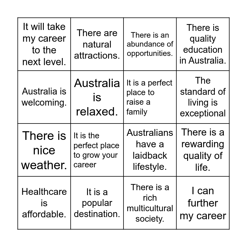This bingo card has 16 words: It is a popular destination., There is a rewarding quality of life., There is an abundance of opportunities., It will take my career to the next level., There is nice weather., There are natural attractions., Australians have a laidback lifestyle., There is a rich multicultural society., Australia is welcoming., Australia is relaxed., Healthcare is affordable., There is quality education in Australia., It is the perfect place to grow your career, The standard of living is exceptional, It is a perfect place to raise a family and I can further my career.