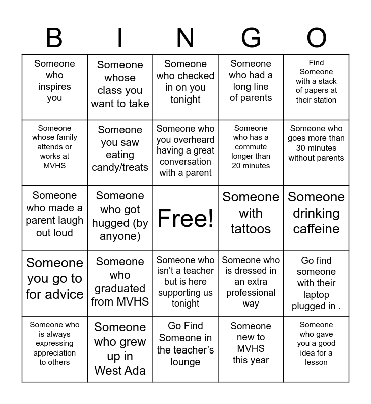 This bingo card has a free space and 24 words: Someone who graduated from MVHS, Someone who grew up in West Ada, Someone who you overheard having a great conversation with a parent, Someone who is always expressing appreciation to others, Find Someone with a stack of papers at their station, Someone who inspires you, Someone whose family attends or works at MVHS, Someone whose class you want to take, Someone with tattoos, Someone who isn’t a teacher but is here supporting us tonight, Someone who has a commute longer than 20 minutes, Someone who made a parent laugh out loud, Someone who is dressed in an extra professional way, Go find someone with their laptop plugged in ., Someone you saw eating candy/treats, Someone new to MVHS this year, Someone drinking caffeine, Someone who checked in on you tonight, Someone who goes more than 30 minutes without parents, Someone who got hugged (by anyone), Someone who gave you a good idea for a lesson, Someone you go to for advice, Someone who had a long line of parents and Go Find Someone in the teacher’s lounge.