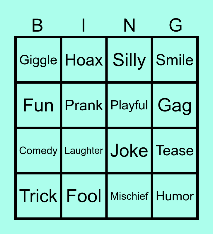 This bingo card has 20 words: Tease, Fake, Silly, Gotcha, Trick, Fun, Fool, Giggle, Comedy, Hoax, Laughter, Joke, Prank, Humor, Playful, Pretend, Gag, Smile, Mischief and Surprise.