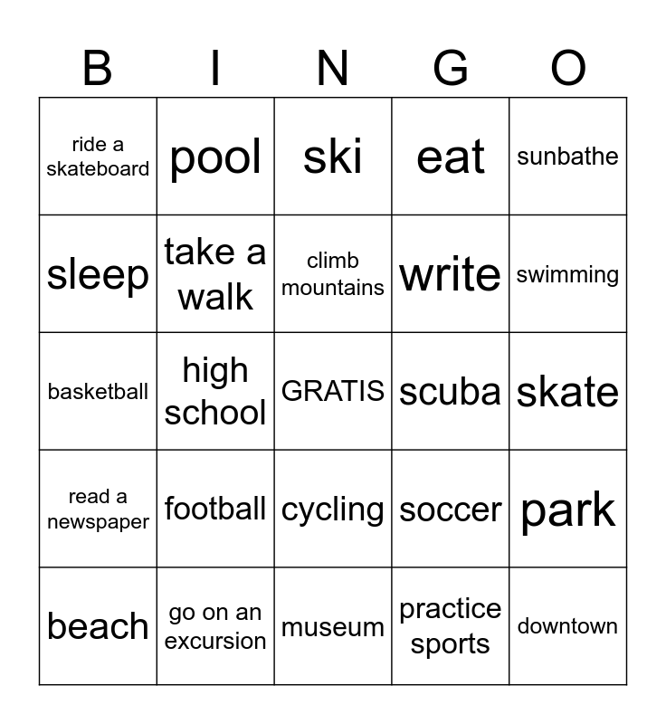 This bingo card has a free space and 34 words: play sports, practice sports, watch movies, read a magazine, read a newspaper, take a walk, sunbathe, beach, pool, movie theater, climb mountains, ski, water ski, visit monuments, scuba, swimming, go on an excursion, basketball, football, soccer, cycling, ride a bike, ride a skateboard, skate, museum, downtown, eat, swim, write, sleep, stadium, high school, park and mall.