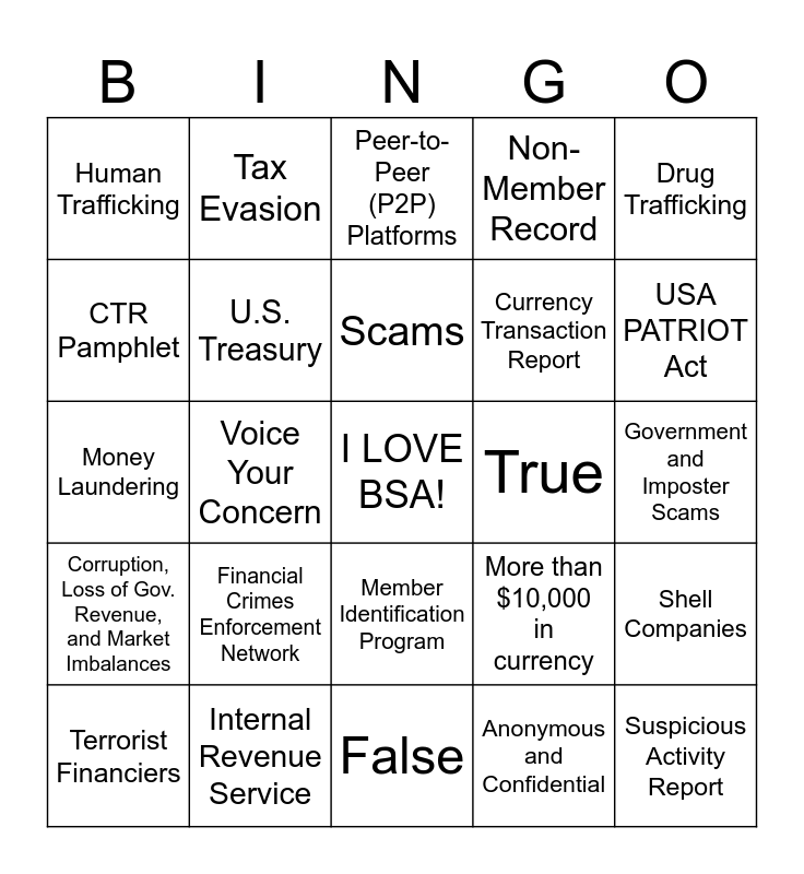This bingo card has a free space and 24 words: Financial Crimes Enforcement Network, Internal Revenue Service, Scams, Terrorist Financiers, Drug Trafficking, Human Trafficking, CTR Pamphlet, Tax Evasion, True, Member Identification Program, Currency Transaction Report, Money Laundering, More than $10,000 in currency, Shell Companies, U.S. Treasury, Anonymous and Confidential, Government and Imposter Scams, Peer-to-Peer (P2P) Platforms, USA PATRIOT Act, Voice Your Concern, Suspicious Activity Report, Corruption, Loss of Gov. Revenue, and Market Imbalances, Non-Member Record and False.