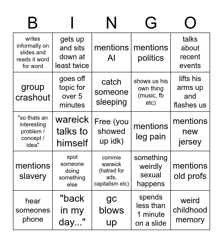 This bingo card has a free space and 29 words: hear someones phone, tech struggles, wareick talks to himself, picks on someone in the front, writes informally on slides and reads it word for word, mentions AI, goes off topic for over 5 minutes, spot someone doing something else, mentions leg pain, "back in my day...", mentions new jersey, weird childhood memory, gc blows up, spends less than 1 minute on a slide, lifts his arms up and flashes us, spends 5+ minutes on a slide, commie warwick (hatred for ads, capitalism etc), mentions slavery, talks about recent events, "so thats an interesting problem / concept / idea", something weirdly sexual happens, wildly biased takes stated as fact, shows us his own thing (music, fb etc), group crashout, mentions politics, gets up and sits down at least twice, mentions old profs, catch someone sleeping and aggressive thumbs up (bonus if with tech issues).