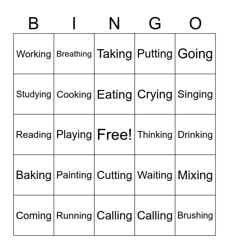 This bingo card has a free space and 24 words: Painting, Running, Eating, Coming, Going, Working, Studying, Breathing, Thinking, Cutting, Crying, Reading, Waiting, Mixing, Cooking, Calling, Drinking, Taking, Singing, Playing, Brushing, Baking, Putting and Calling.