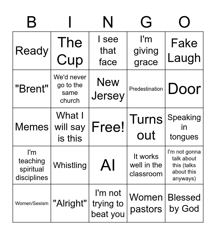 This bingo card has a free space and 24 words: Whistling, "Alright", New Jersey, Women/Sexism, Fake Laugh, Ready, "Brent", The Cup, Turns out, AI, Predestination, Memes, It works well in the classroom, I'm not gonna talk about this (talks about this anyways), We'd never go to the same church, Women pastors, Speaking in tongues, I see that face, Door, What I will say is this, Blessed by God, I'm teaching spiritual disciplines, I'm giving grace and I'm not trying to beat you.