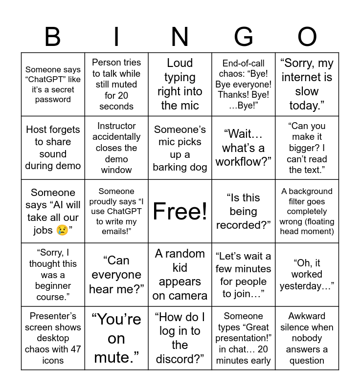 This bingo card has a free space and 24 words: “Can everyone hear me?”, “You’re on mute.”, Someone’s mic picks up a barking dog, Presenter’s screen shows desktop chaos with 47 icons, “Sorry, my internet is slow today.”, Someone says “ChatGPT” like it’s a secret password, Host forgets to share sound during demo, Person tries to talk while still muted for 20 seconds, “Is this being recorded?”, A random kid appears on camera, “Wait… what’s a workflow?”, Someone says “AI will take all our jobs 😢”, “Let’s wait a few minutes for people to join…”, “Oh, it worked yesterday…”, Instructor accidentally closes the demo window, Someone types “Great presentation!” in chat… 20 minutes early, A background filter goes completely wrong (floating head moment), Loud typing right into the mic, “Can you make it bigger? I can’t read the text.”, Someone proudly says “I use ChatGPT to write my emails!”, Awkward silence when nobody answers a question, “Sorry, I thought this was a beginner course.”, End-of-call chaos: “Bye! Bye everyone! Thanks! Bye! …Bye!” and “How do I log in to the discord?”.
