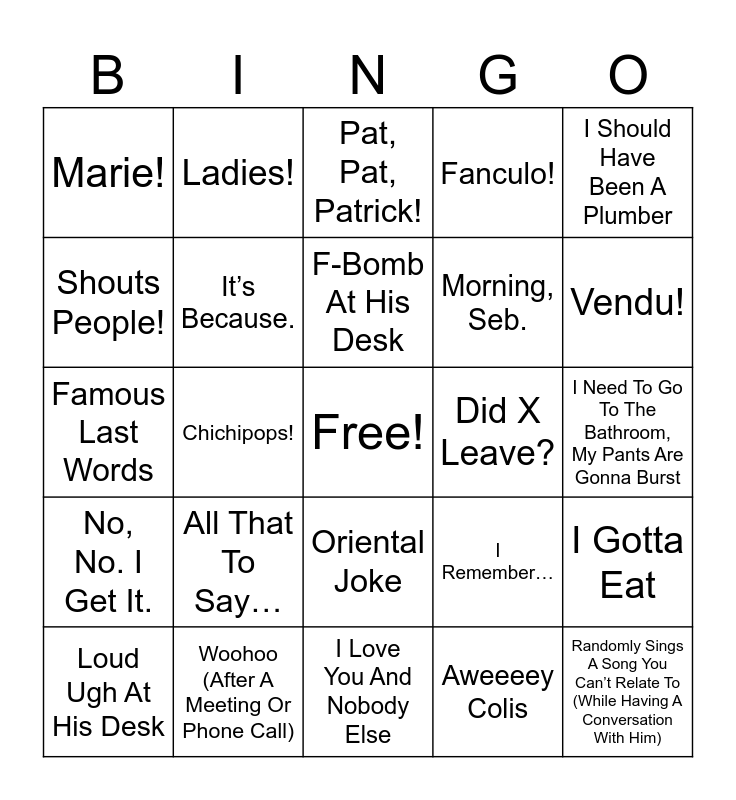 This bingo card has a free space and 42 words: I Love You And Nobody Else, F-Bomb At His Desk, Loud Ugh At His Desk, All That To Say…, Aweeeey Colis, I Gotta Eat, Randomly Sings A Song You Can’t Relate To (While Having A Conversation With Him), Hummm… Le Bon Sucre À La Crème, Pat, Pat, Patrick!, Oriental Joke, I Need To Go To The Bathroom, My Pants Are Gonna Burst, Vendu!, Chichipops!, I Should Have Been A Plumber, I Gotta Get On A Call, I Remember…, WÂÂSHROOM, Famous Last Words, Lito!, Ladies!, Shouts People!, I’m Gonna Go Get A Coffee, I’m Not Blaming You., Marie!, Coughing Fit, What’s The Fastest Land Animal?, Morning, Seb., Don’t Bust/Break Your Head, Tabarnak, I Still Didn’t Catch Up On Email, Salam!, No, No. I Get It., It’s Because., I Love You And Nobody Else, Vendu, Loud Ugh At His Desk, Woohoo (After A Meeting Or Phone Call), Did X Leave?, I Remember…, I Need To Go To The Bathroom, My Pants Are Gonna Burst, Fanculo! and You Hot ’Cause You Fat.