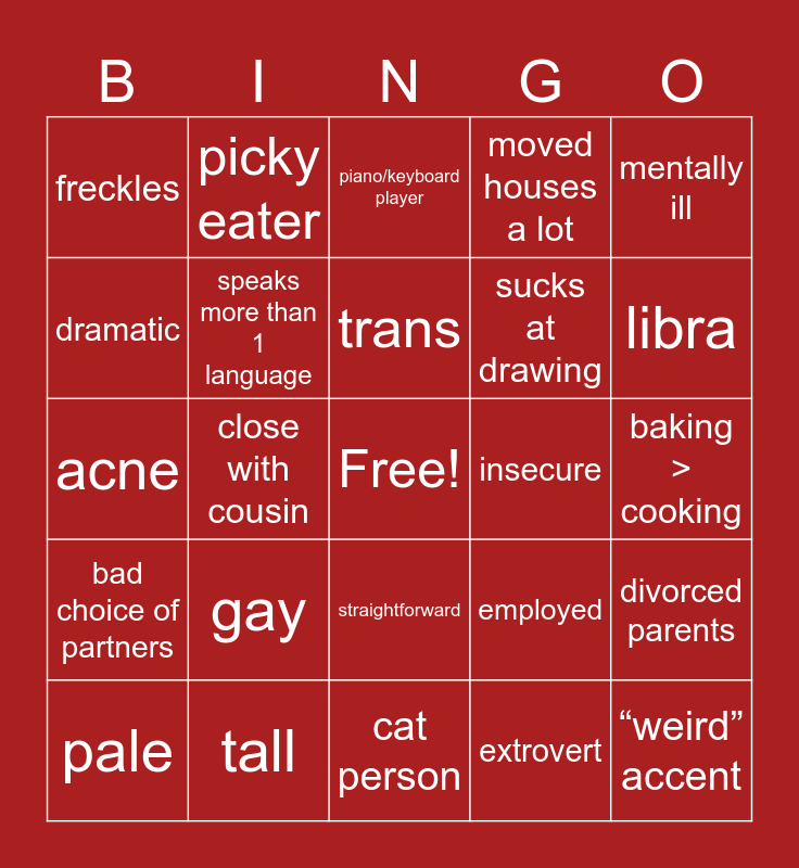 This bingo card has a free space and 24 words: gay, tall, trans, pale, mentally ill, freckles, dramatic, picky eater, insecure, straightforward, sucks at drawing, acne, employed, divorced parents, speaks more than 1 language, extrovert, baking > cooking, piano/keyboard player, libra, close with cousin, “weird” accent, bad choice of partners, moved houses a lot and cat person.