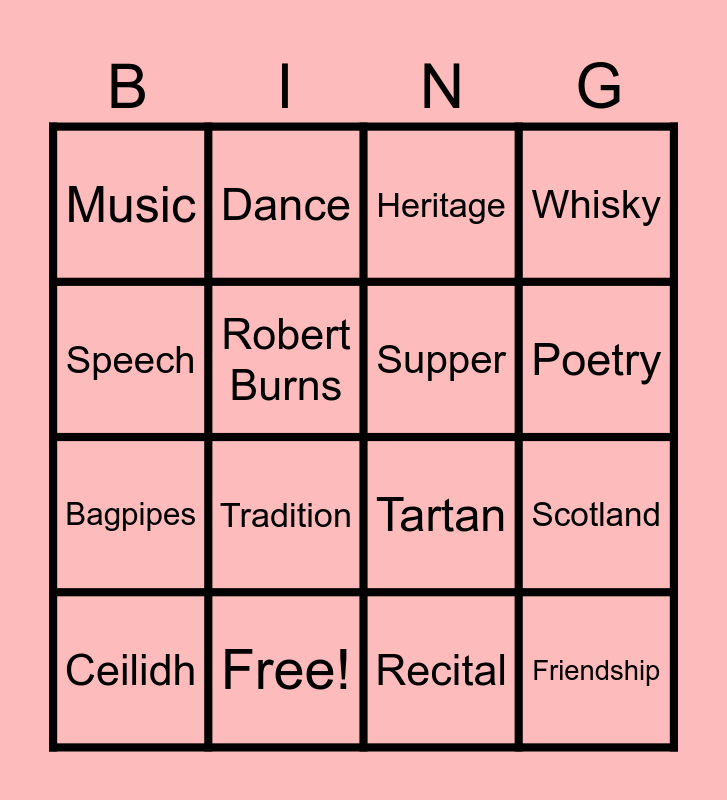 This bingo card has 21 words: Free!, Toast, Dance, Culture, Recital, Supper, Music, Heritage, Tartan, Poetry, Bagpipes, Whisky, Friendship, Poem, Robert Burns, Celebration, Ceilidh, Tradition, Speech, Scotland and Haggis.