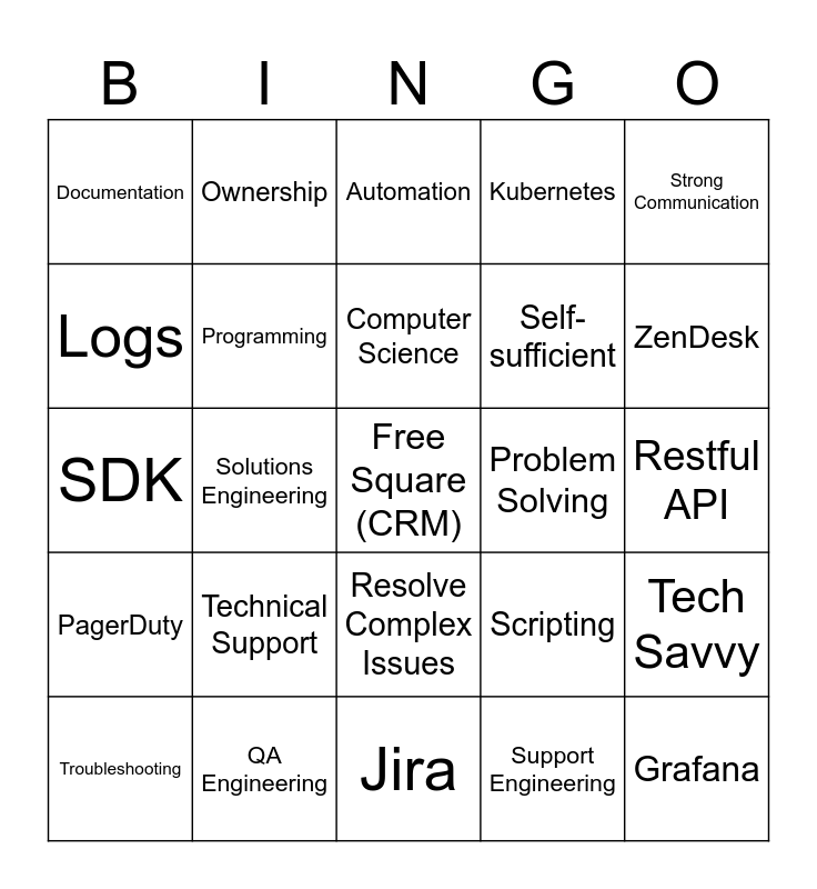 This bingo card has a free space and 24 words: Technical Support, QA Engineering, Computer Science, Troubleshooting, Strong Communication, Documentation, Logs, Ownership, Problem Solving, Resolve Complex Issues, Self-sufficient, SDK, Scripting, Tech Savvy, Programming, Support Engineering, Restful API, Automation, ZenDesk, Solutions Engineering, Grafana, PagerDuty, Kubernetes and Jira.