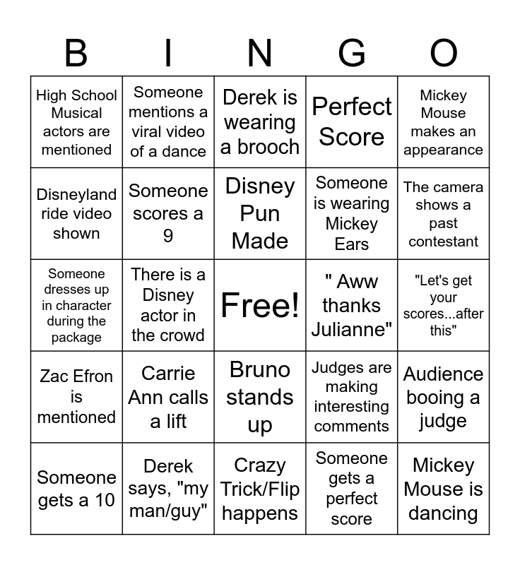 This bingo card has a free space and 24 words: Carrie Ann calls a lift, Derek says, "my man/guy", Disney Pun Made, Someone gets a 10, Mickey Mouse makes an appearance, High School Musical actors are mentioned, Disneyland ride video shown, Someone mentions a viral video of a dance, " Aww thanks Julianne", Bruno stands up, Someone is wearing Mickey Ears, Someone dresses up in character during the package, Judges are making interesting comments, Audience booing a judge, Someone scores a 9, Someone gets a perfect score, "Let's get your scores...after this", Derek is wearing a brooch, The camera shows a past contestant, There is a Disney actor in the crowd, Mickey Mouse is dancing, Zac Efron is mentioned, Perfect Score and Crazy Trick/Flip happens.