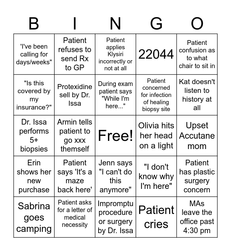 This bingo card has a free space and 24 words: Patient says 'It's a maze back here', Patient asks for a letter of medical necessity, During exam patient says "While I'm here...", Sabrina goes camping, Patient confusion as to what chair to sit in, 'I've been calling for days/weeks", "Is this covered by my insurance?", Patient refuses to send Rx to GP, Olivia hits her head on a light, Jenn says "I can't do this anymore", Patient concerned for infection of healing biopsy site, Dr. Issa performs 5+ biopsies, "I don't know why I'm here", Patient has plastic surgery concern, Protexidine sell by Dr. Issa, Patient cries, Upset Accutane mom, Patient applies Klysiri incorrectly or not at all, Kat doesn't listen to history at all, Armin tells patient to go xxx themself, MAs leave the office past 4:30 pm, Erin shows her new purchase, 22044 and Impromptu procedure or surgery by Dr. Issa.