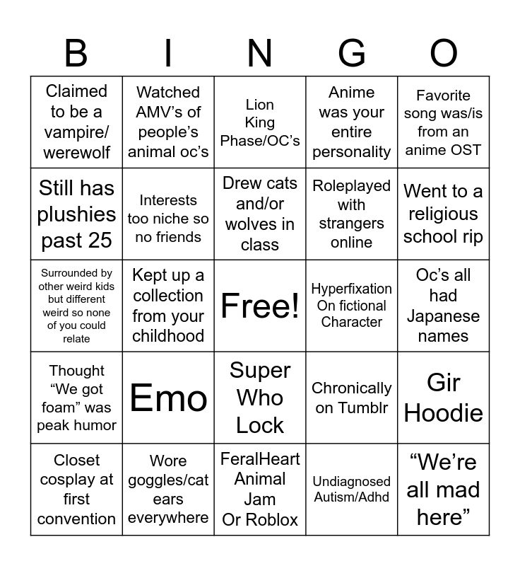 This bingo card has a free space and 24 words: Emo, Wore goggles/cat ears everywhere, Drew cats and/or wolves in class, Closet cosplay at first convention, Favorite song was/is from an anime OST, Claimed to be a vampire/ werewolf, Still has plushies past 25, Watched AMV’s of people’s animal oc’s, Hyperfixation On fictional Character, Super Who Lock, Roleplayed with strangers online, Surrounded by other weird kids but different weird so none of you could relate, Chronically on Tumblr, Gir Hoodie, Interests too niche so no friends, Undiagnosed Autism/Adhd, Oc’s all had Japanese names, Lion King Phase/OC’s, Went to a religious school rip, Kept up a collection from your childhood, “We’re all mad here”, Thought “We got foam” was peak humor, Anime was your entire personality and FeralHeart Animal Jam Or Roblox.