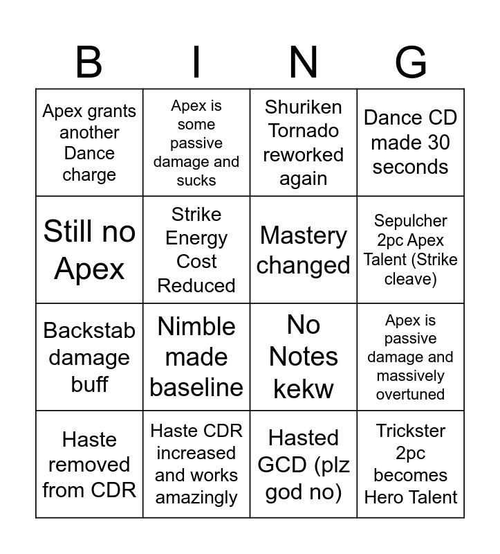 This bingo card has 16 words: Haste CDR increased and works amazingly, Apex is passive damage and massively overtuned, Shuriken Tornado reworked again, Apex grants another Dance charge, Backstab damage buff, Apex is some passive damage and sucks, No Notes kekw, Hasted GCD (plz god no), Still no Apex, Strike Energy Cost Reduced, Haste removed from CDR, Dance CD made 30 seconds, Nimble made baseline, Sepulcher 2pc Apex Talent (Strike cleave), Mastery changed and Trickster 2pc becomes Hero Talent.