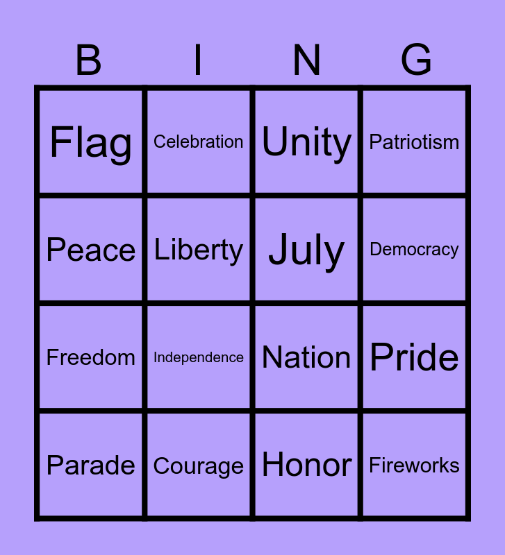 This bingo card has 20 words: Pride, Declaration, Unity, Barbecue, Parade, Peace, Courage, Flag, Freedom, Celebration, Independence, Nation, Liberty, Fireworks, July, History, Democracy, Patriotism, Honor and Picnic.