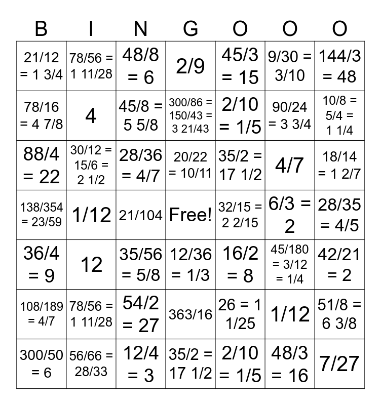 This bingo card has a free space and 48 words: 26 = 1 1/25, 90/24 = 3 3/4, 35/2 = 17 1/2, 1/12, 28/36 = 4/7, 28/35 = 4/5, 78/56 = 1 11/28, 56/66 = 28/33, 9/30 = 3/10, 12/36 = 1/3, 144/3 = 48, 2/9, 4/7, 35/2 = 17 1/2, 108/189 = 4/7, 6/3 = 2, 78/16 = 4 7/8, 10/8 = 5/4 = 1 1/4, 1/12, 45/3 = 15, 2/10 = 1/5, 21/104, 21/12 = 1 3/4, 4, 51/8 = 6 3/8, 45/8 = 5 5/8, 18/14 = 1 2/7, 300/50 = 6, 20/22 = 10/11, 30/12 = 15/6 = 2 1/2, 48/3 = 16, 32/15 = 2 2/15, 42/21 = 2, 78/56 = 1 11/28, 138/354 = 23/59, 16/2 = 8, 45/180 = 3/12 = 1/4, 88/4 = 22, 35/56 = 5/8, 54/2 = 27, 36/4 = 9, 7/27, 48/8 = 6, 12/4 = 3, 300/86 = 150/43 = 3 21/43, 363/16, 12 and 2/10 = 1/5.