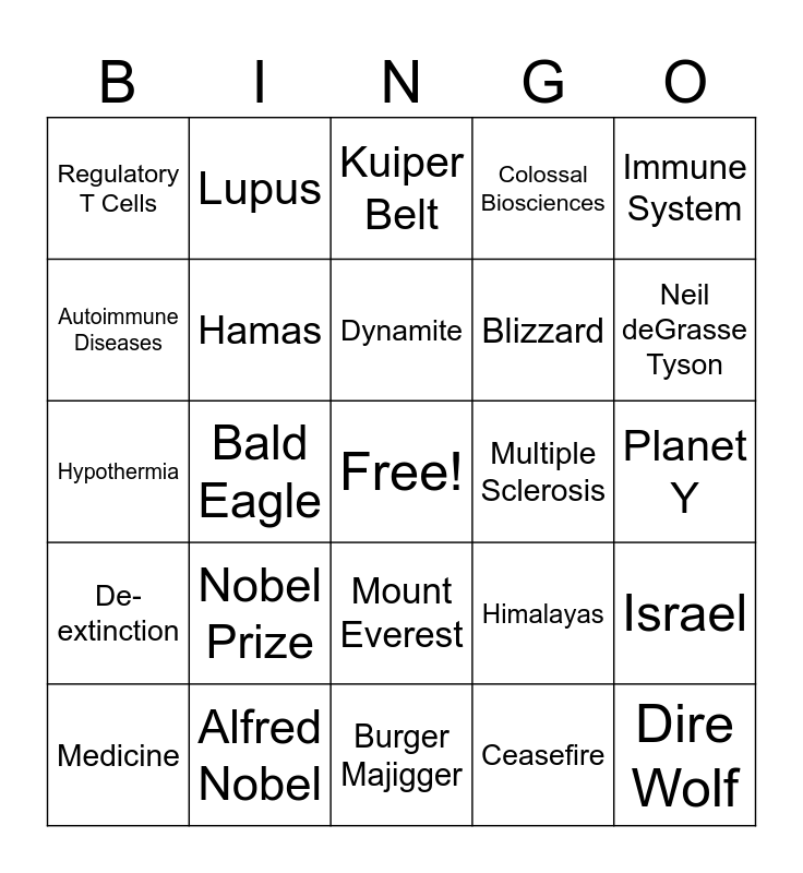 This bingo card has a free space and 24 words: Nobel Prize, Alfred Nobel, Dynamite, Medicine, Immune System, Regulatory T Cells, Autoimmune Diseases, Lupus, Multiple Sclerosis, Mount Everest, Blizzard, Hypothermia, Himalayas, Israel, Hamas, Ceasefire, Planet Y, Kuiper Belt, Neil deGrasse Tyson, Bald Eagle, Dire Wolf, De-extinction, Colossal Biosciences and Burger Majigger.