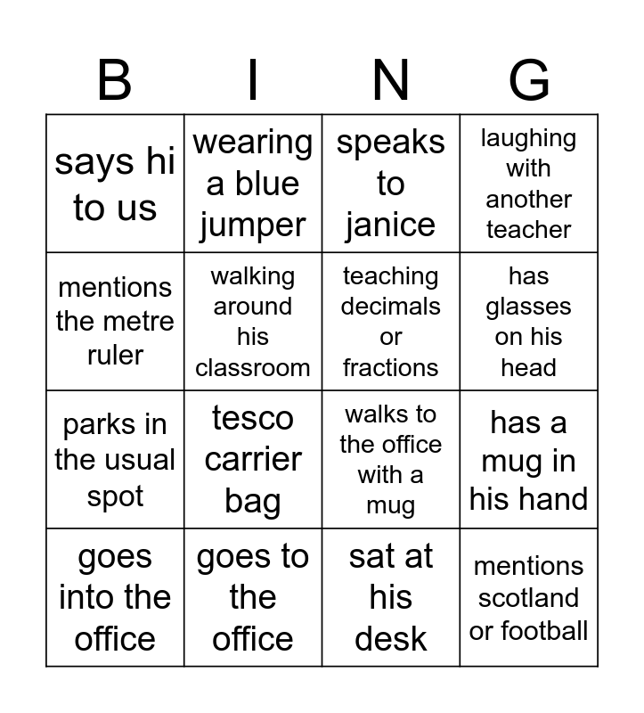 This bingo card has 16 words: goes to the office, has a mug in his hand, speaks to janice, says hi to us, parks in the usual spot, wearing a blue jumper, walks to the office with a mug, sat at his desk, mentions the metre ruler, walking around his classroom, goes into the office, laughing with another teacher, tesco carrier bag, has glasses on his head, teaching decimals or fractions and mentions scotland or football.