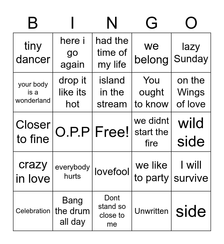 This bingo card has a free space and 29 words: Celebration, Mambo No. 5, O.P.P, you Sexy thing, tiny dancer, had the time of my life, drop it like its hot, everybody hurts, we didnt start the fire, Bang the drum all day, wild side, side, Dont stand so close to me, Unwritten, on the Wings of love, river runs red, lovefool, crazy in love, lazy Sunday, Closer to fine, we like to party, Goodbye lover, You ought to know, your body is a wonderland, we belong, here i go again, I will survive, island in the stream and stayin alive.