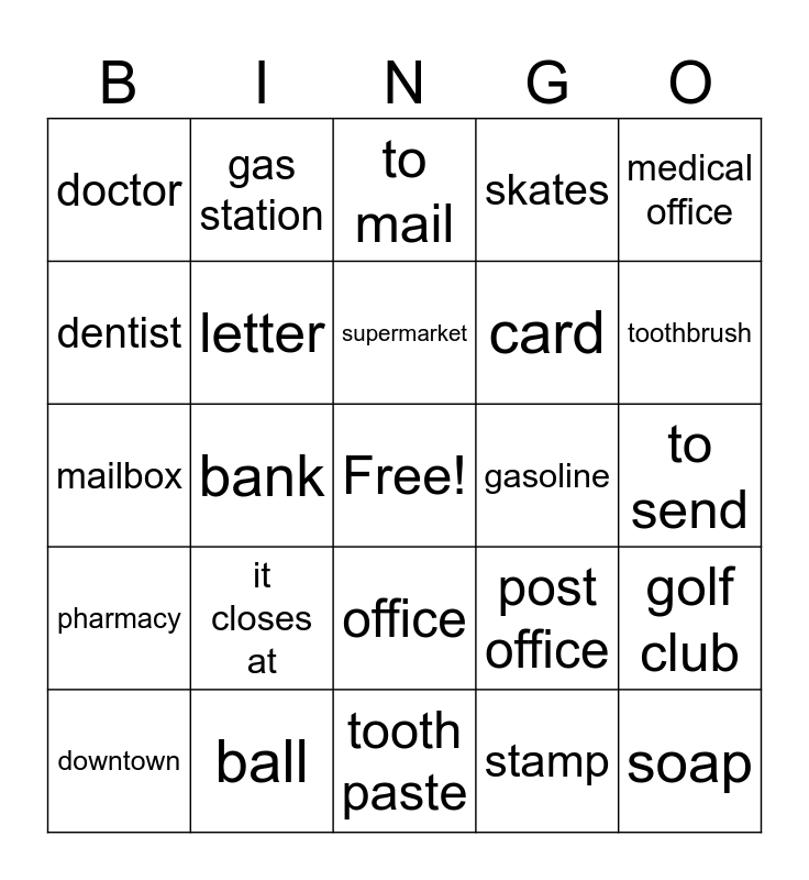This bingo card has a free space and 24 words: it closes at, ball, supermarket, downtown, medical office, doctor, dentist, gas station, gasoline, office, card, mailbox, post office, golf club, letter, stamp, to send, to mail, toothbrush, bank, soap, pharmacy, skates and tooth paste.