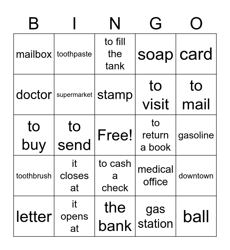 This bingo card has a free space and 24 words: it closes at, it opens at, stamp, letter, card, mailbox, doctor, toothpaste, to return a book, to cash a check, to visit, to buy, medical office, downtown, supermarket, gas station, gasoline, to fill the tank, to mail, to send, ball, toothbrush, soap and the bank.