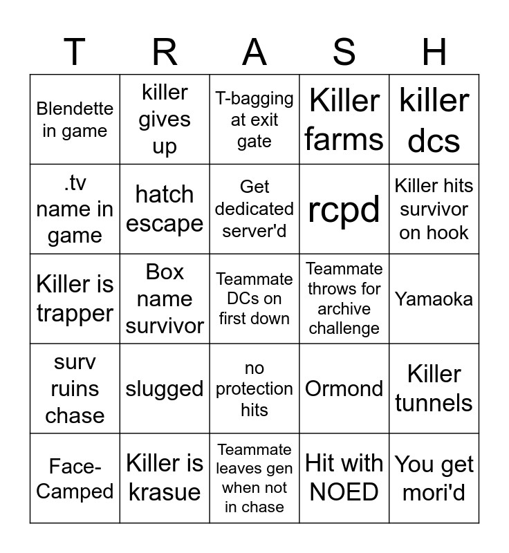This bingo card has a free space and 24 words: slugged, Killer is krasue, Get dedicated server'd, Face-Camped, killer dcs, Blendette in game, .tv name in game, killer gives up, Teammate throws for archive challenge, no protection hits, rcpd, Killer is trapper, Ormond, Killer tunnels, hatch escape, Hit with NOED, Yamaoka, T-bagging at exit gate, Killer hits survivor on hook, Box name survivor, You get mori'd, surv ruins chase, Killer farms and Teammate leaves gen when not in chase.