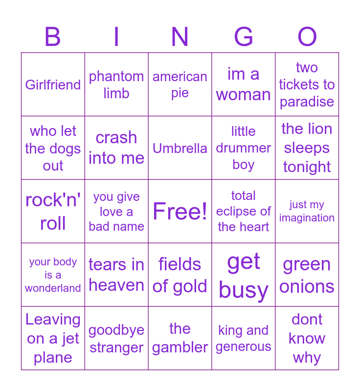 This bingo card has a free space and 29 words: Leaving on a jet plane, Take a chance on me, you give love a bad name, runaway train, Girlfriend, american pie, crash into me, tears in heaven, total eclipse of the heart, goodbye stranger, just my imagination, dont know why, the gambler, king and generous, the lion sleeps tonight, you were meant for me, fields of gold, your body is a wonderland, two tickets to paradise, rock'n' roll, get busy, the office theme, little drummer boy, who let the dogs out, im a woman, phantom limb, green onions, Umbrella and here you come again.