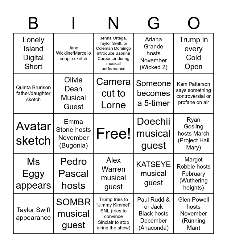 This bingo card has a free space and 24 words: Pedro Pascal hosts, SOMBR musical guest, Camera cut to Lorne, Taylor Swift appearance, Trump in every Cold Open, Lonely Island Digital Short, Quinta Brunson father/daughter sketch, Jane Wickline/Marcello couple sketch, Doechii musical guest, Alex Warren musical guest, Someone becomes a 5-timer, Avatar sketch, KATSEYE musical guest, Margot Robbie hosts February (Wuthering heights), Olivia Dean Musical Guest, Paul Rudd & or Jack Black hosts December (Anaconda), Ryan Gosling hosts March (Project Hail Mary), Jenna Ortega, Taylor Swift, or Coleman Domingo introduce Sabrina Carpenter during musical performance, Kam Patterson says something controversial or profane on air, Emma Stone hosts November (Bugonia), Glen Powell hosts November (Running Man), Ms Eggy appears, Ariana Grande hosts November (Wicked 2) and Trump tries to “Jimmy Kimmel” SNL (tries to convince Sinclair to stop airing the show).