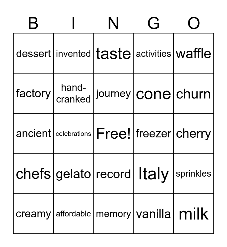 This bingo card has a free space and 24 words: creamy, gelato, journey, vanilla, waffle, dessert, invented, taste, freezer, cherry, ancient, hand-cranked, Italy, sprinkles, factory, affordable, memory, activities, churn, chefs, celebrations, record, cone and milk.