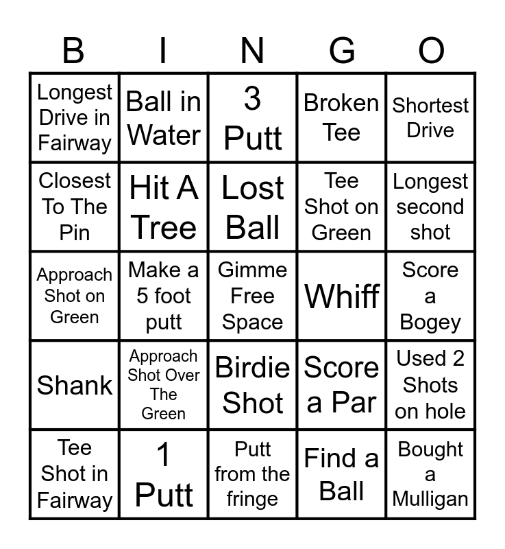 This bingo card has a free space and 24 words: Approach Shot Over The Green, 1 Putt, Lost Ball, Tee Shot in Fairway, Shortest Drive, Longest Drive in Fairway, Closest To The Pin, Ball in Water, Whiff, Birdie Shot, Tee Shot on Green, Approach Shot on Green, Score a Par, Used 2 Shots on hole, Hit A Tree, Find a Ball, Score a Bogey, 3 Putt, Longest second shot, Make a 5 foot putt, Bought a Mulligan, Shank, Broken Tee and Putt from the fringe.